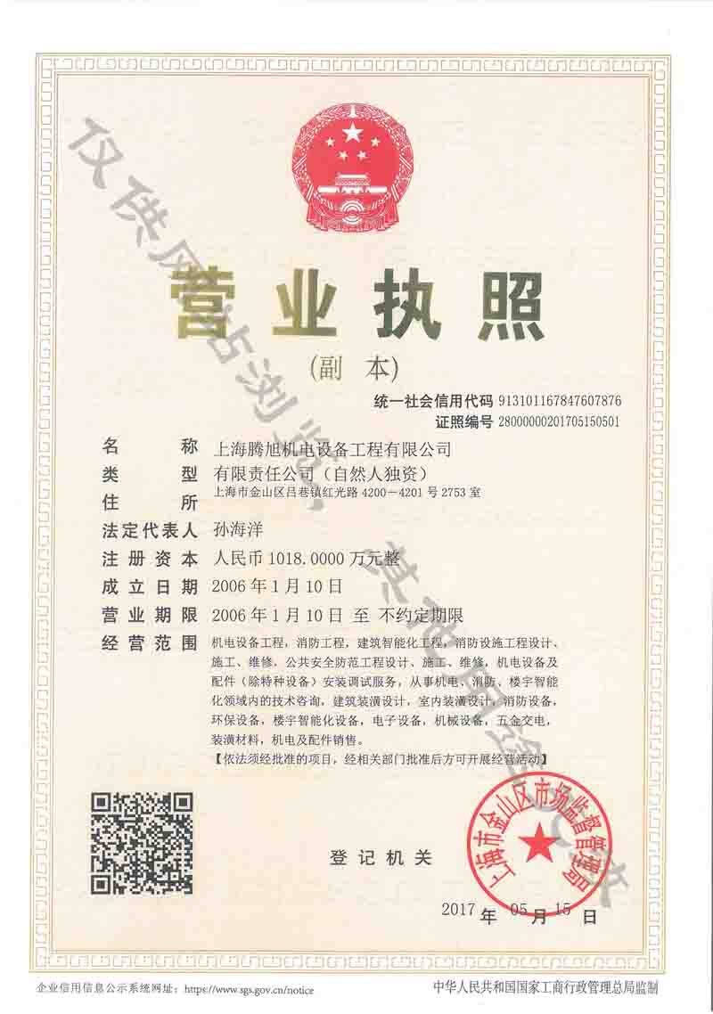 上海腾旭机电设备工程有限公司成立于2006年1月,注册资金1018万元,是一家具有消防设施工程专业承包壹级资质、达到社会消防技术服务(消防设施维护保养检测与安全评估)从业标准的专业施工与服务企业,同时具有机电设备工程施工叁级资质的专业施工和技术服务企业。主要承接民用建筑与工业设施中的火灾自动报警系统、自动喷淋灭火系统、消火栓系统、水喷雾灭火系统、气体灭火系统、泡沫灭火系统、防排烟系统、钢结构防火涂料等各类消防工程,以及通风空调、制冷、电气、仪表、电机、压缩机机组等各类安装工程。
