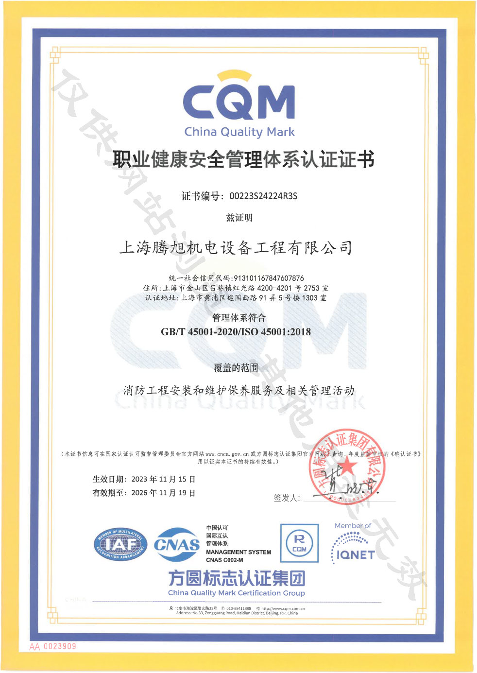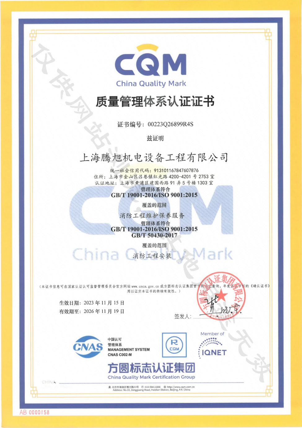 “100%一次验收合格”是公司对消防工程的质量承诺。在企业发展中树立品牌战略,严格按照《GB/T50430-2017工程建设施工企业质量管理规范》和《GB/T19001-2016质量管理体系》、《GB/T24001-2016环境管理体系》、《GB/T45001-2020职业健康安全管理体系》标准,建立质量管理体系、环境管理体系和职业健康安全管理体系,实现项目规范管理。用精湛的专业的技术水平、优良的施工质量、规范的维护保养检测与安全评估服务赢得顾客认同,打造“腾旭”品牌。